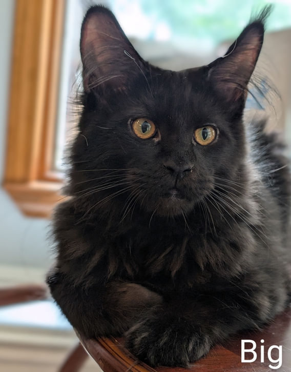 Big Blue - Reserved - $1,800 Male neutered DOB 3/6/2025 Ready for new home Black-low black smoke Queen Ireena & Sire Archer A stunning, very black Maine Coon kitten with daddy's copper colored eyes. Sweet and playful.